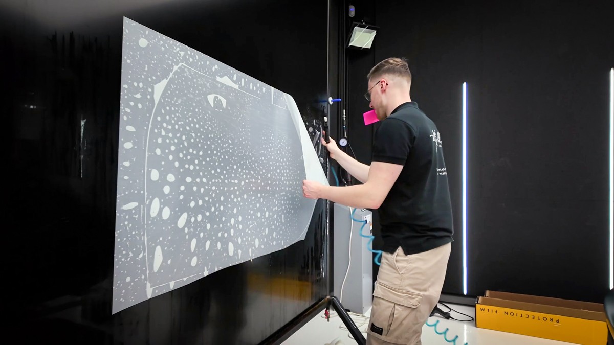 Pose du film PPF sur le pare-choc avant, le capot, les ailes, les rétroviseurs et les bas de caisse.