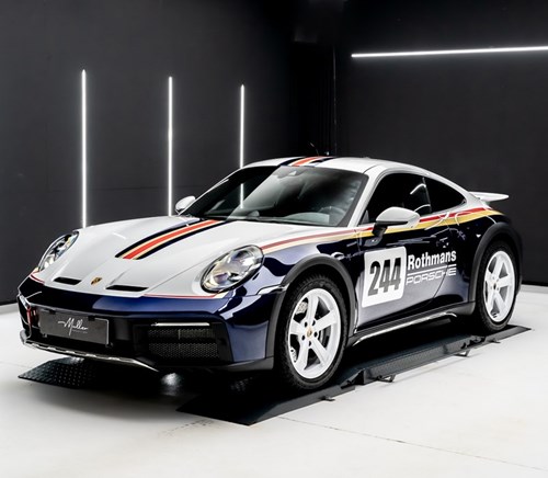 Porsche propose un pack « design rallye » pour la première fois, avec une peinture bicolore emblématique (blanc/bleu Enzian métallisé), des jantes blanches, et la possibilité de choisir un numéro de course entre 0 et 999 sur les portières. L'inscription « Roughroads » reflète la philosophie du modèle, remplaçant celle d'une célèbre marque de cigarettes.