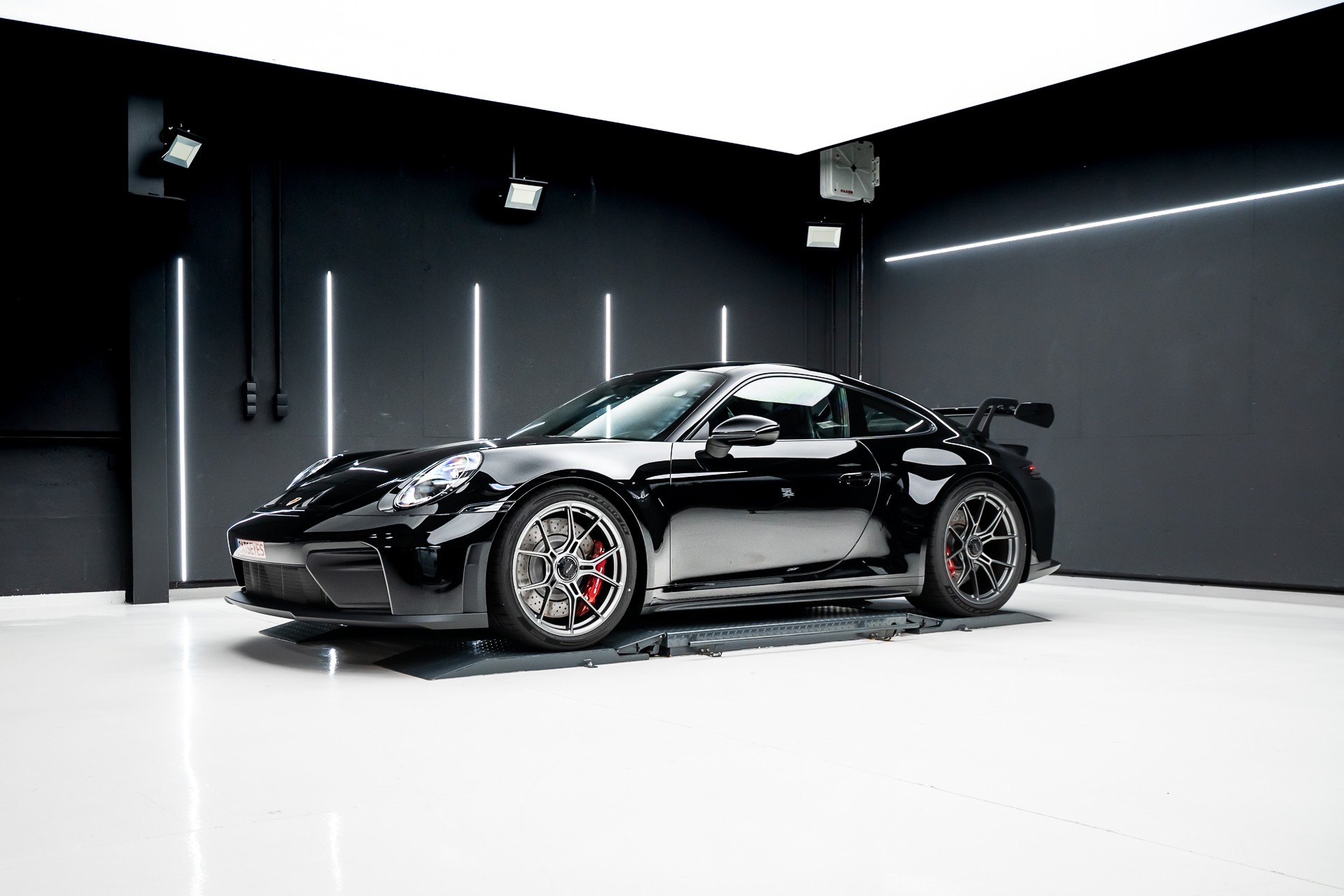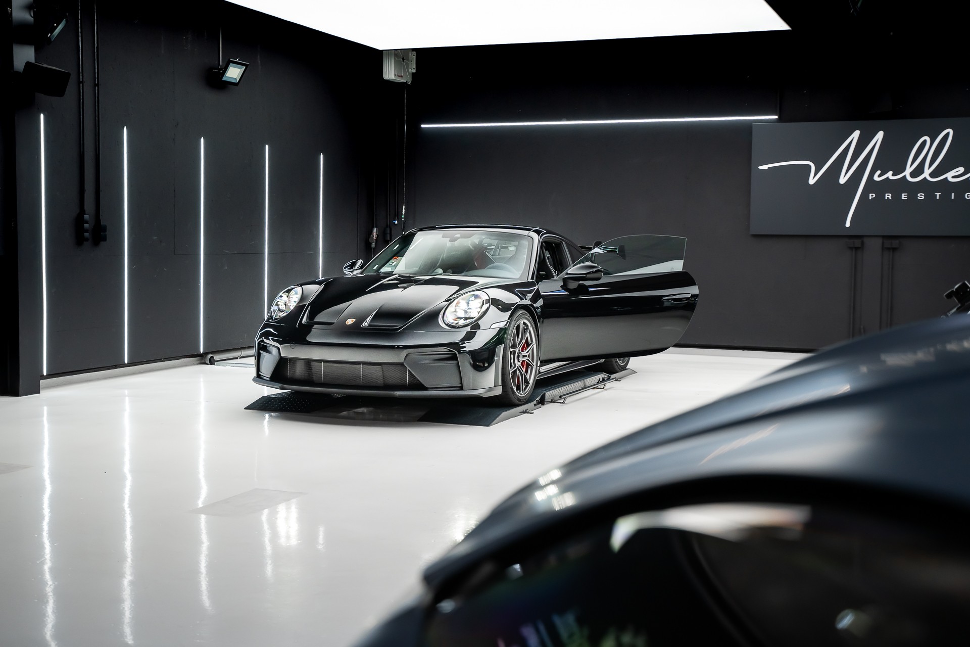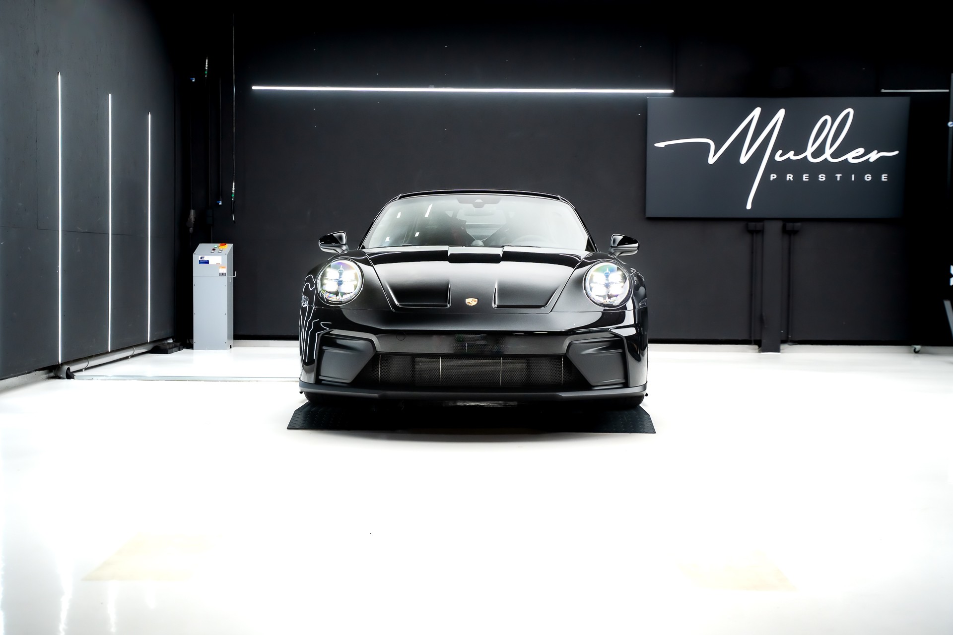 Protection par film PPF sur Porsche 911 GT3 noire : préservation complète de la carrosserie contre les rayures, projections de pierres et agressions extérieures