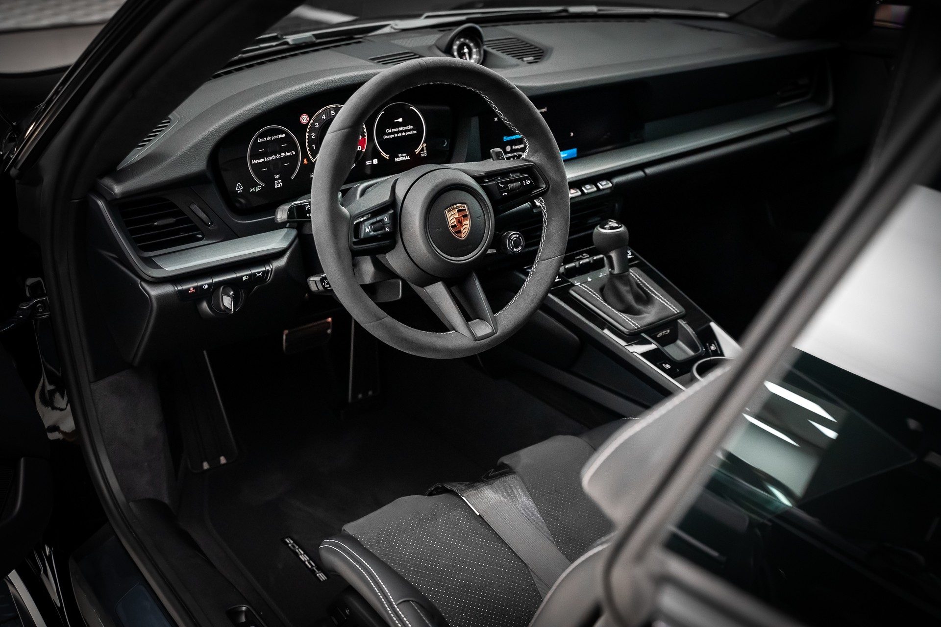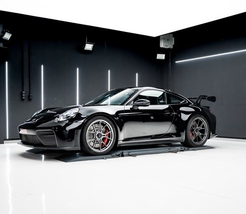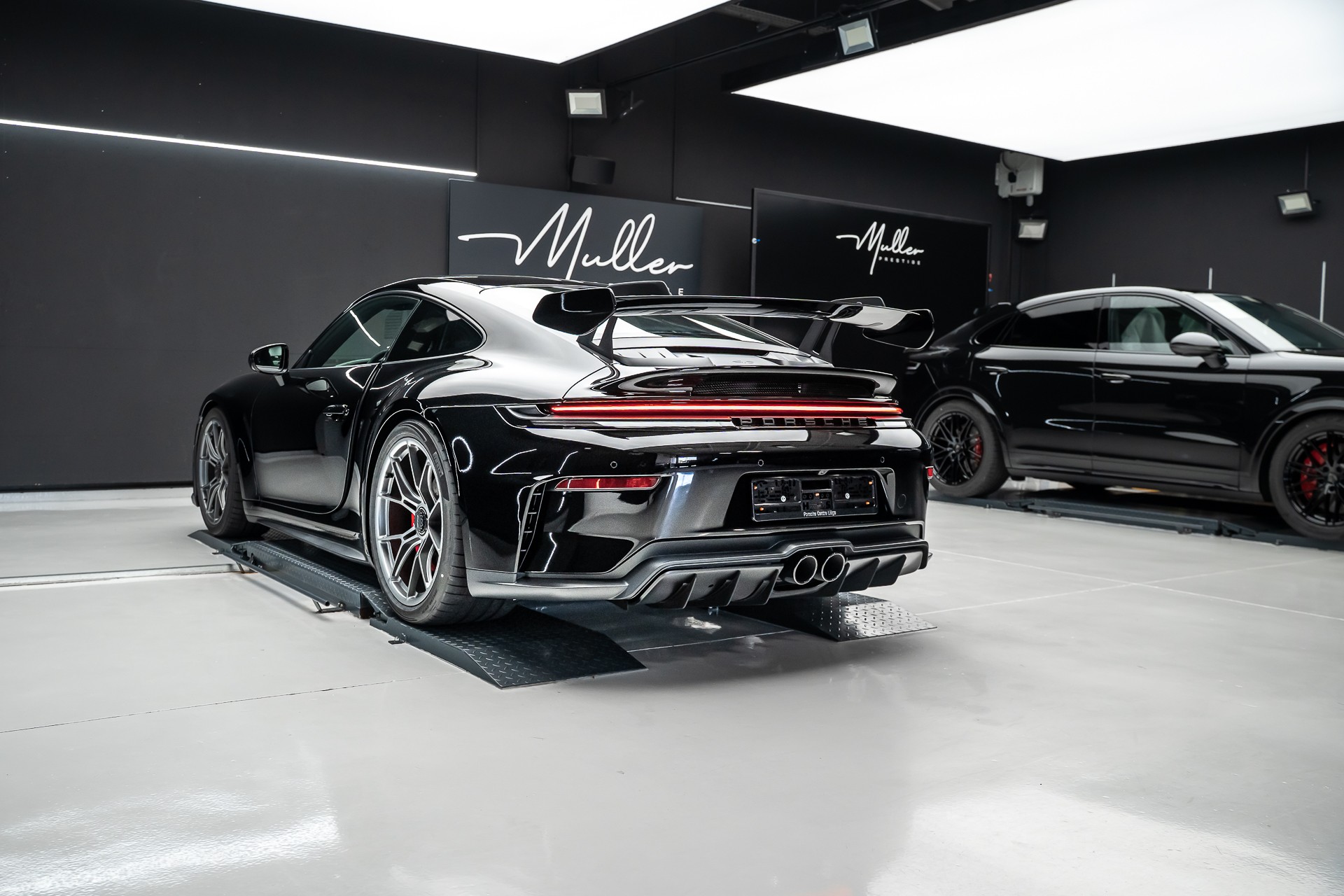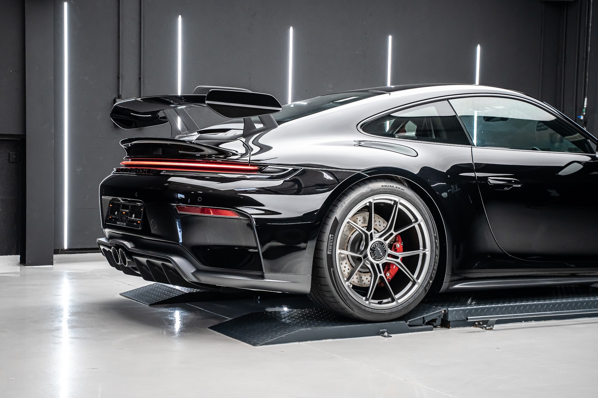 Protection par film PPF sur Porsche 911 GT3 noire : préservation complète de la carrosserie contre les rayures, projections de pierres et agressions extérieures