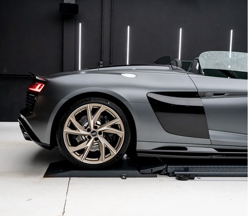 La puissante Audi R8, équipée d'un moteur V10 atmosphérique, offre une variante performance avec 456 kW (620 ch), améliorant l'accélération à 3,2 secondes et la vitesse maximale à 329 km/h. Le couple de 580 Nm à 6 500 tr/min souligne sa performance, tandis que le spoiler arrière en fibre de carbone témoigne de sa puissance.