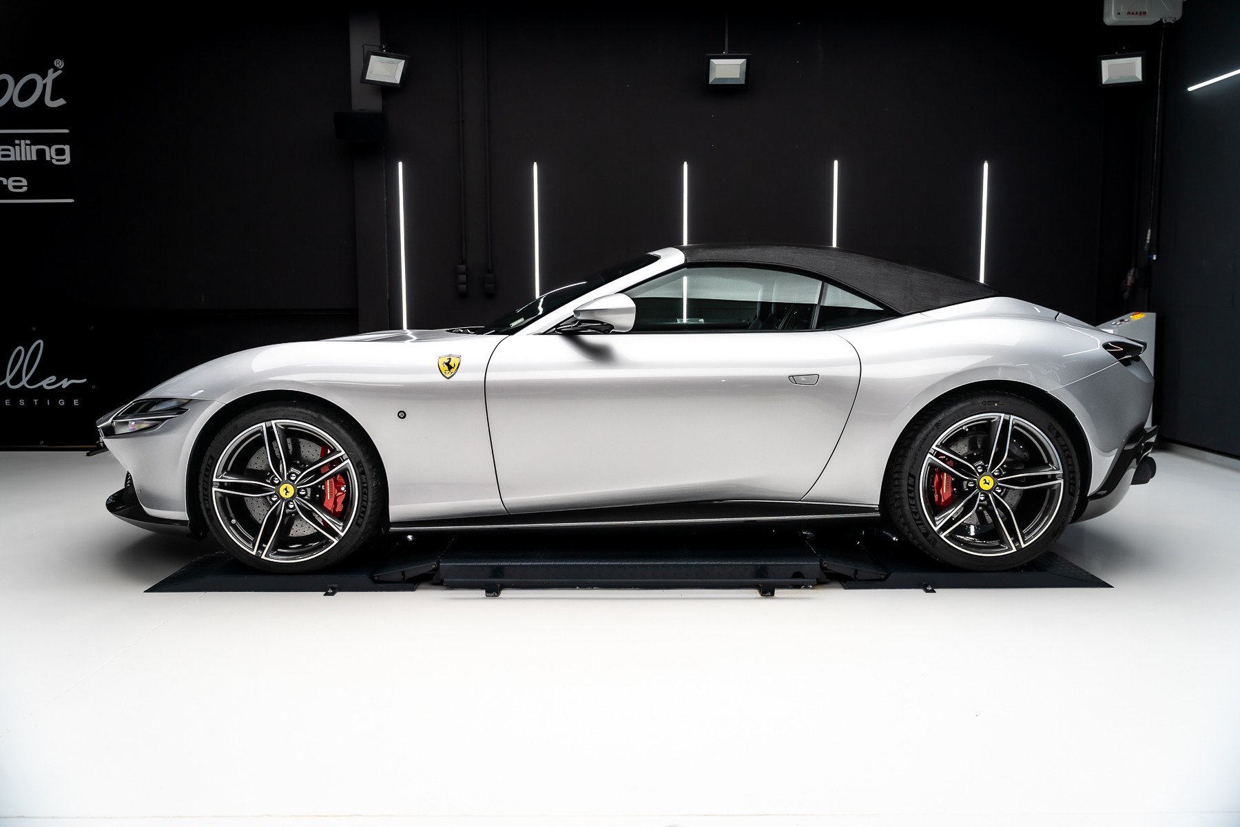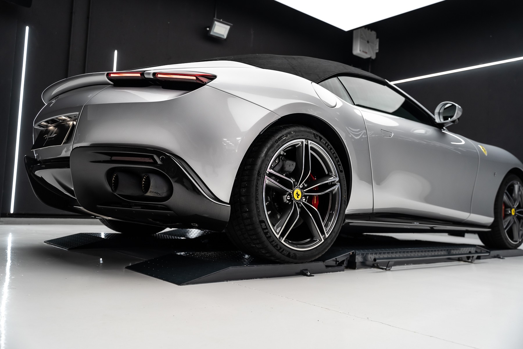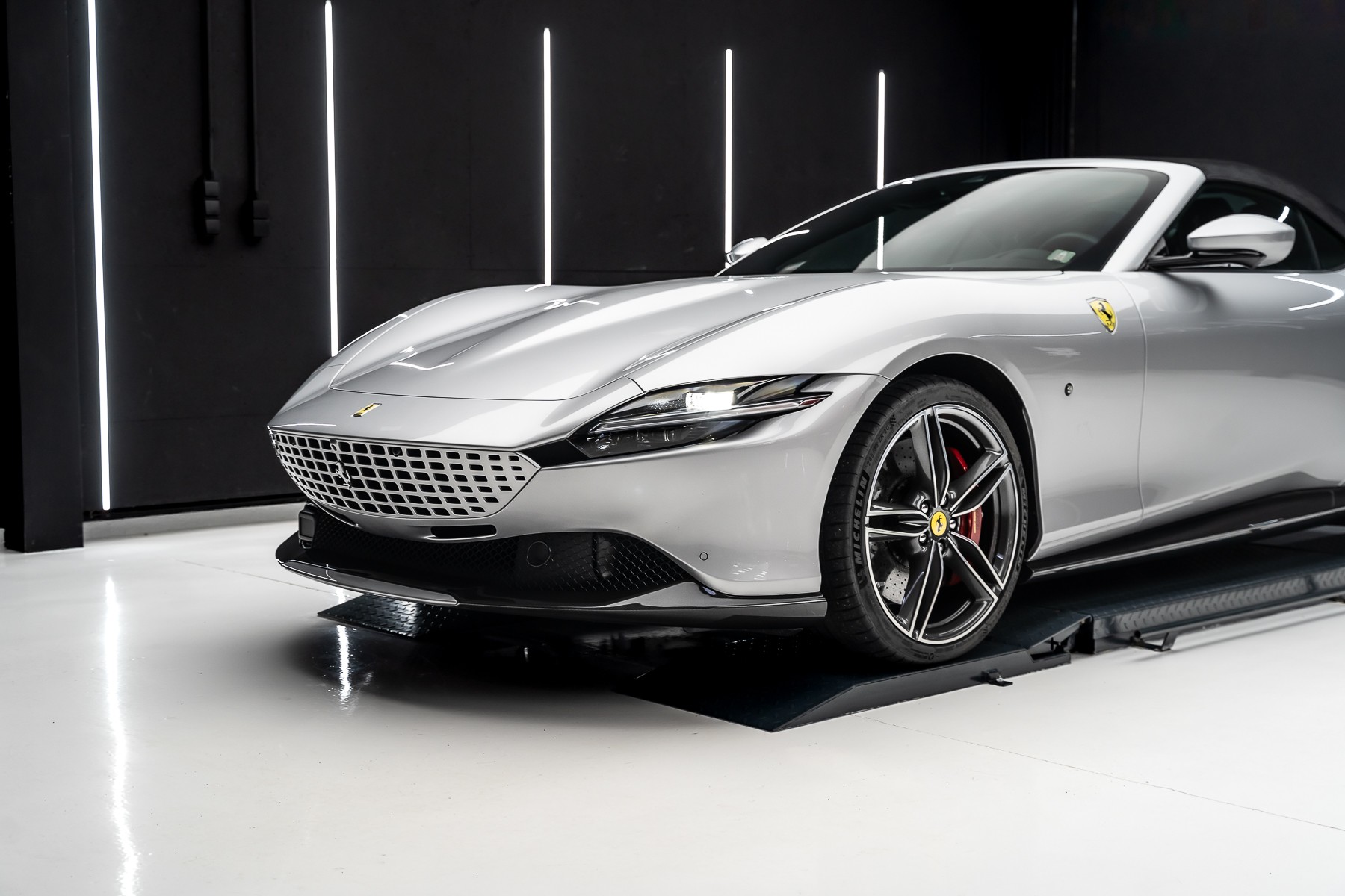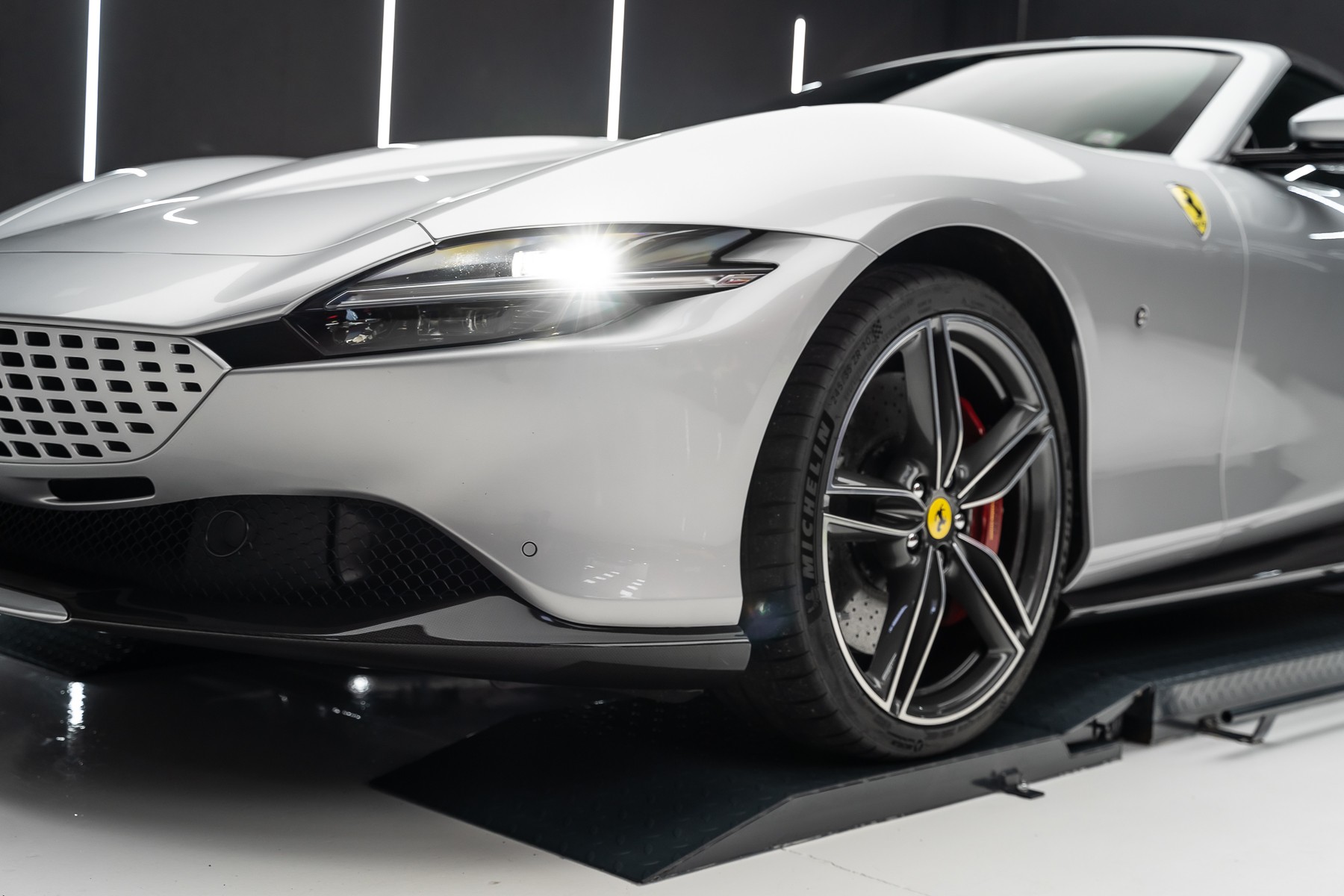 Pose de film PPF sur Ferrari Roma Spider : protection haut de gamme de la carrosserie contre les rayures, projections de pierres et agressions extérieures.