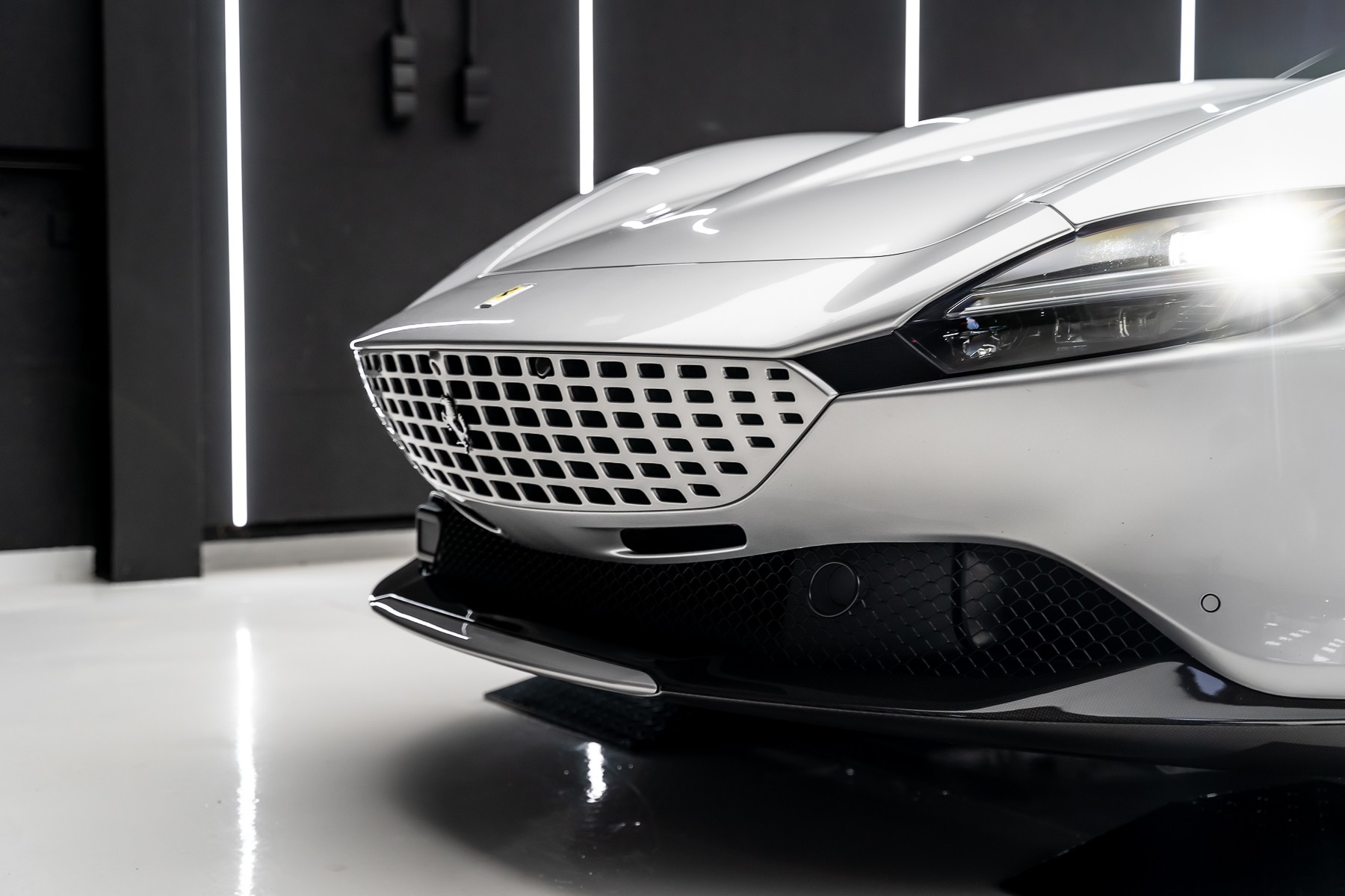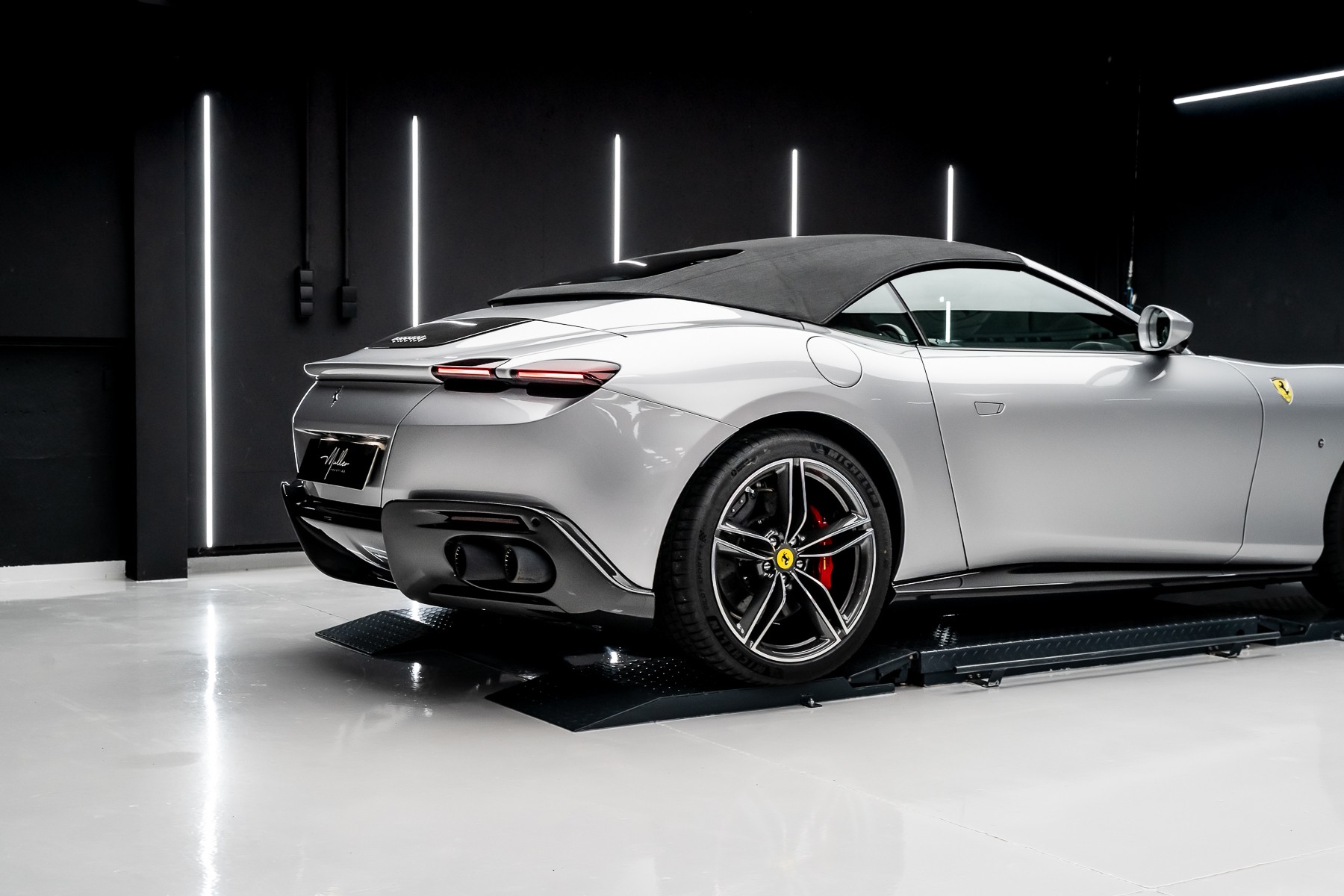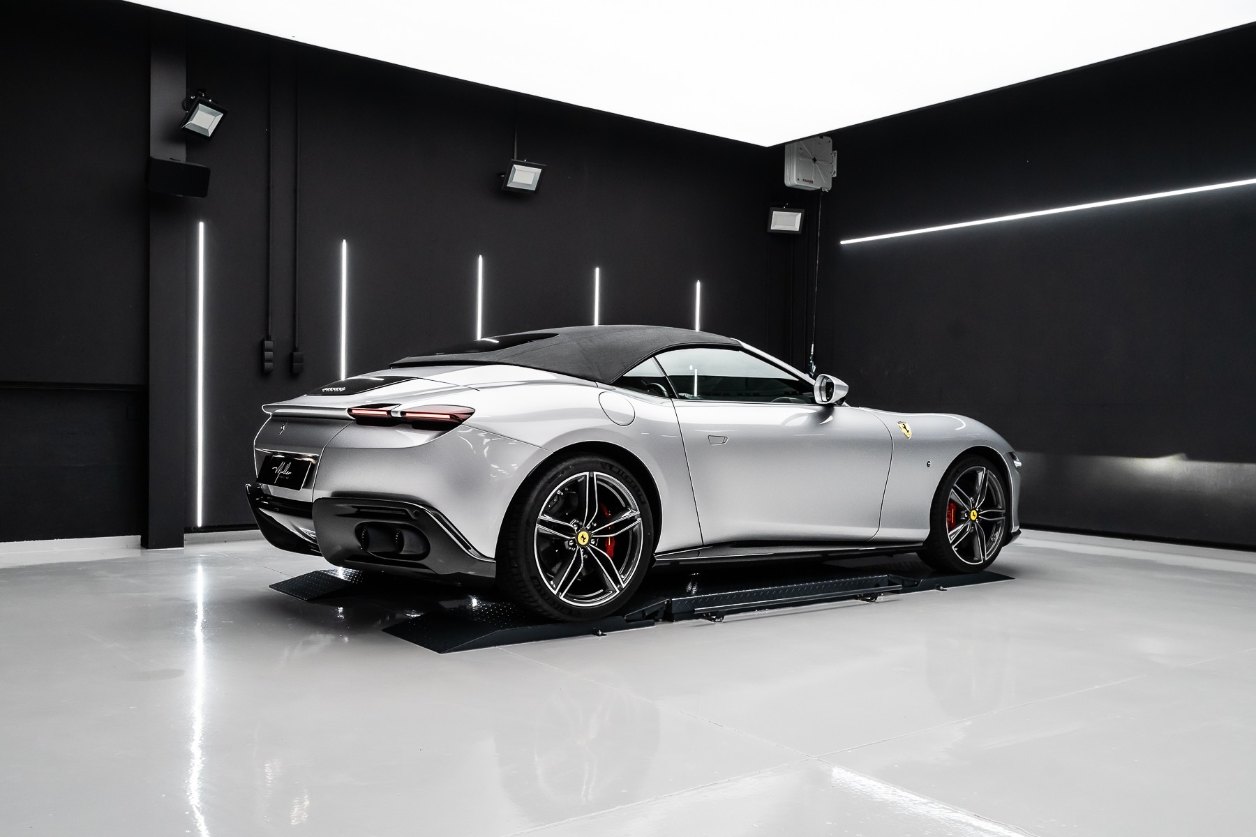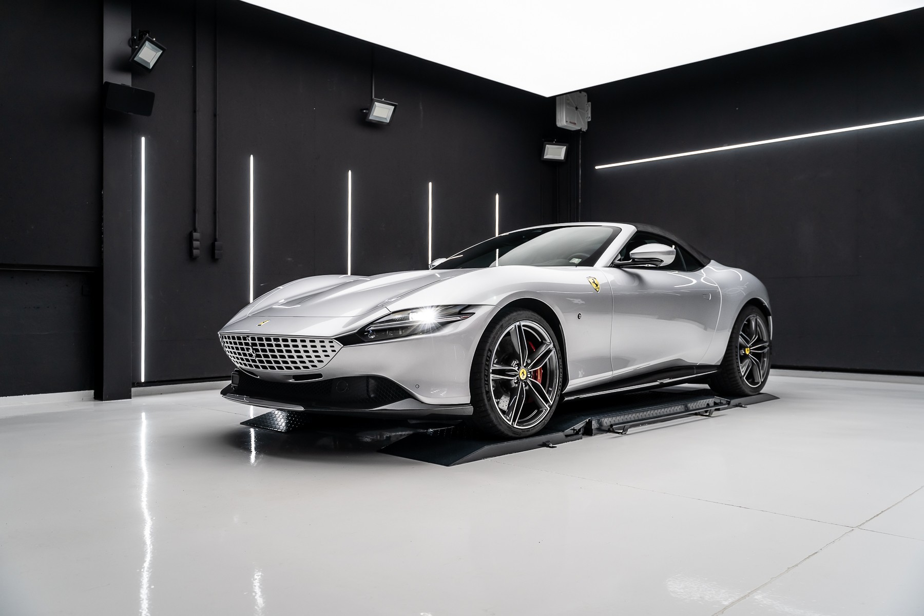 Pose de film PPF sur Ferrari Roma Spider : protection haut de gamme de la carrosserie contre les rayures, projections de pierres et agressions extérieures.